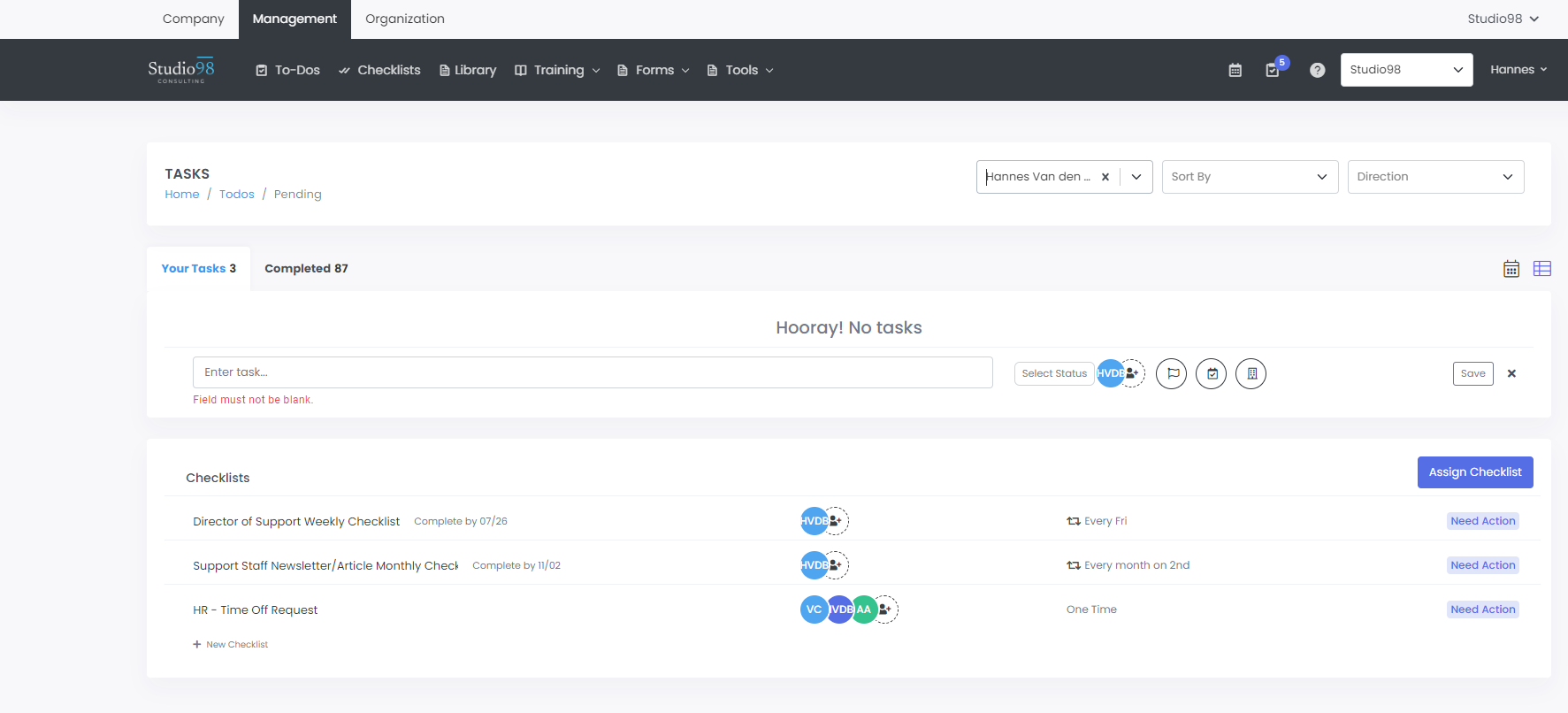 Ensure that your One Truth is created, documented and followed using our Management module. This allows you to create an organized repository of essential resources like policies, manuals, and more. Develop tailored training programs, assign tasks, and prioritize them effectively to ensure seamless operations. Use customizable checklists to streamline recurring tasks and easily track progress by individual or team.