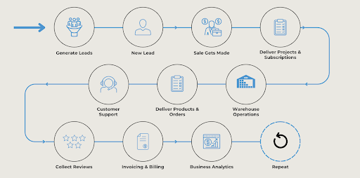 This flow ensures that each stage of your business is handled efficiently, connecting all processes from lead generation to delivery and beyond.